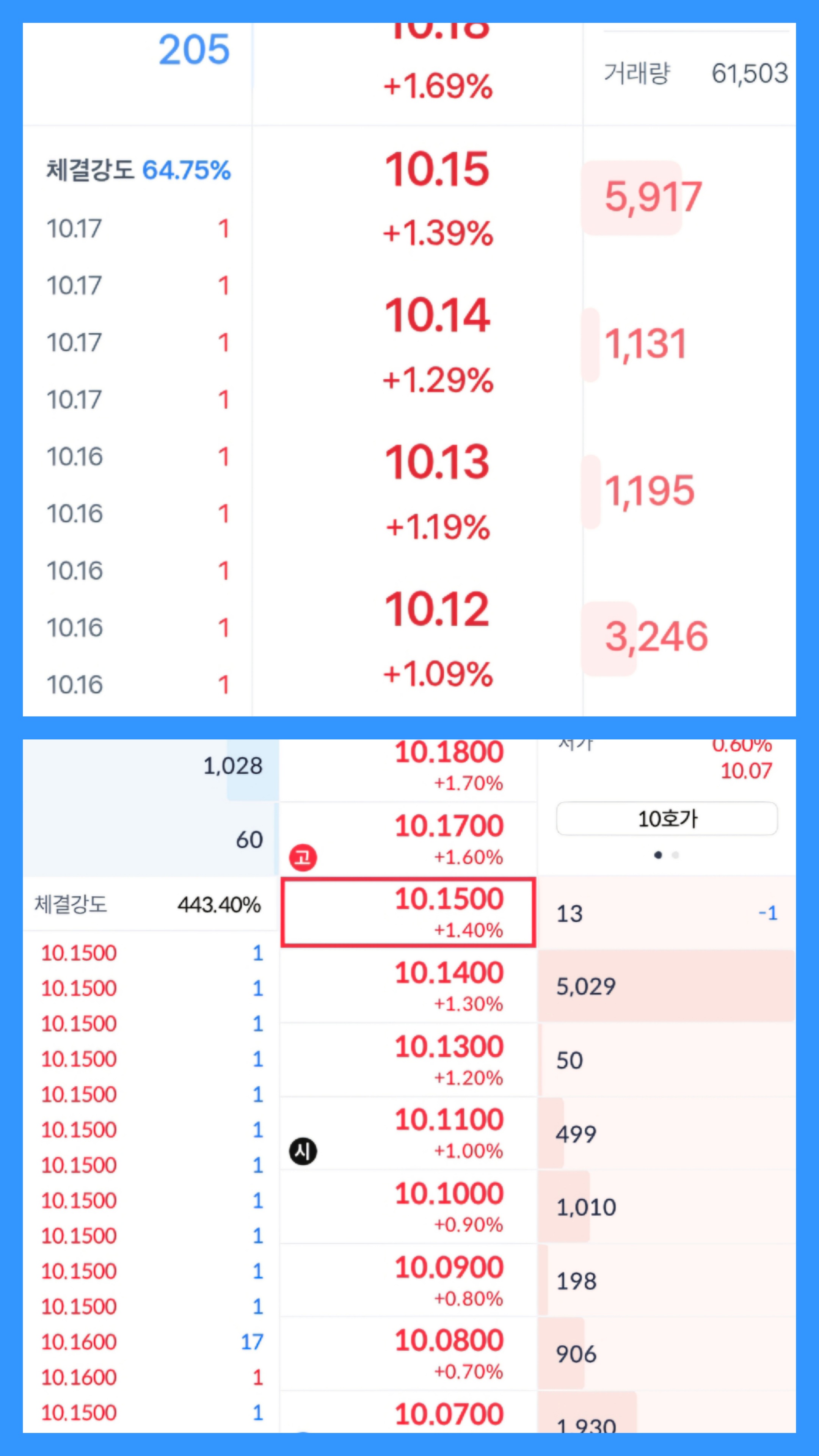 - 핵심 데이터: 체결강도 443.40%