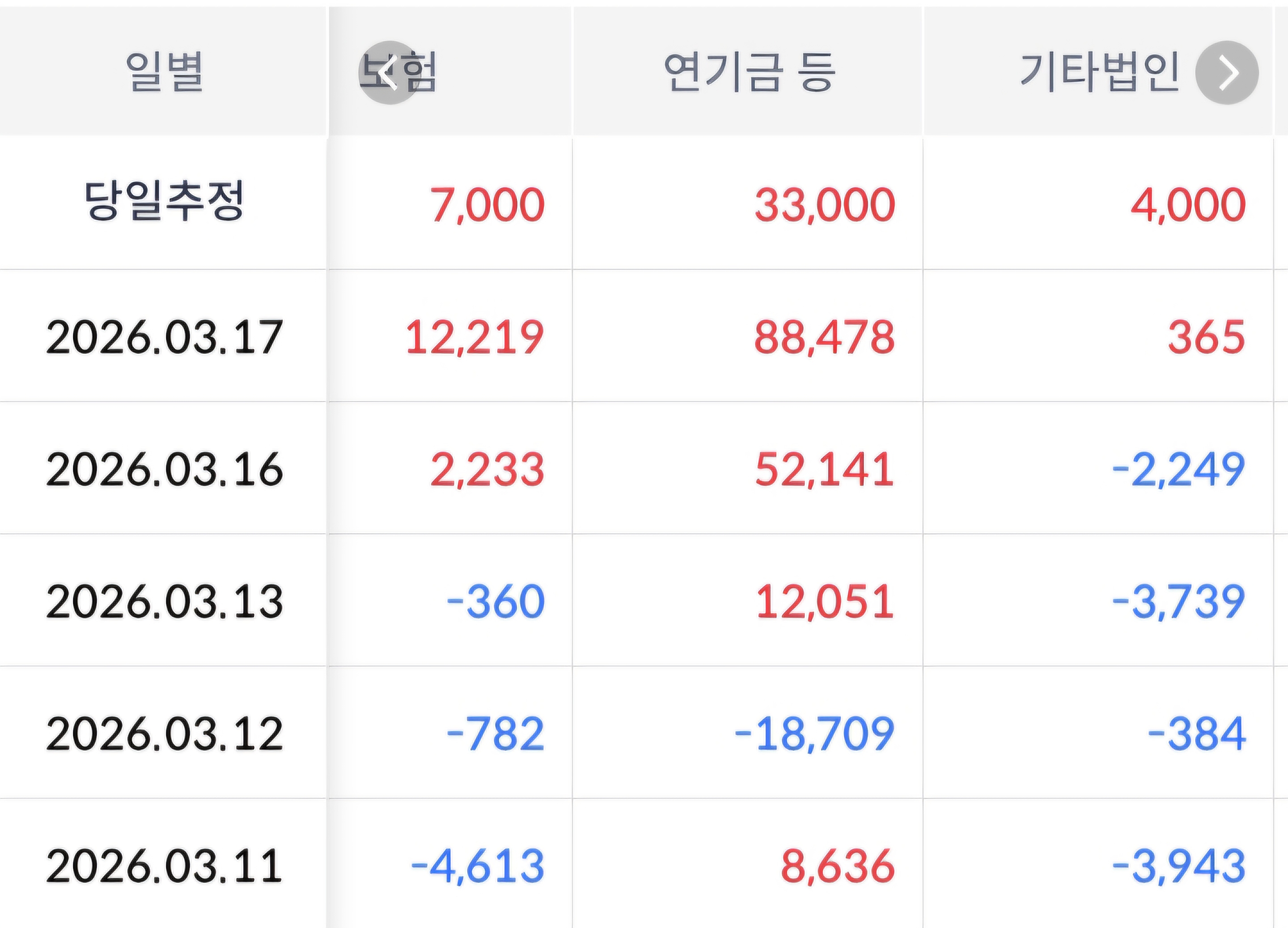 특히 3월 17일 당일 추정치를 보면 외국인이 약 12만 주, 기관이 약 17만 주를 순매수하며 주가를 끌어올리고 있습니다. 외국인과 기관의 평균 매수가가 76,000원~77,000원 선에 형성되어 있어, 현재 가격인 79,800원은 심리적으로 안정적인 구간이라 판단됩니다.