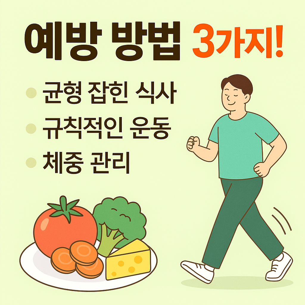 • 체중 관리: 허리둘레가 남성은 90cm, 여성은 85cm 이하로 유지되도록 합니다.