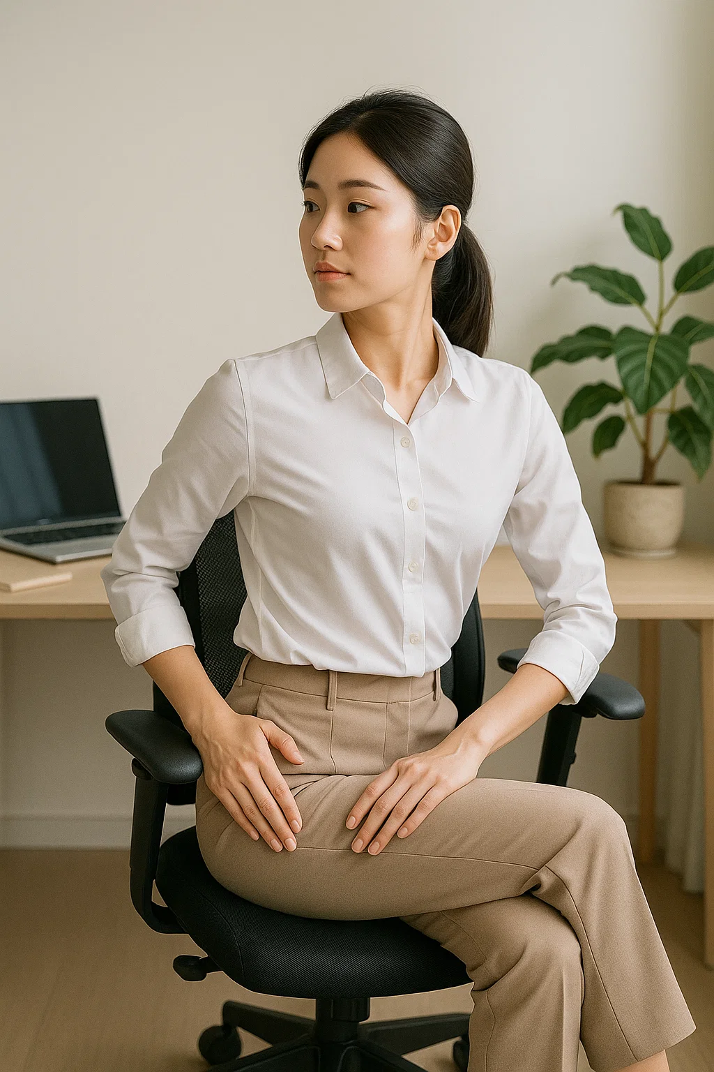 - 몸을 오른쪽으로 돌려 오른손은 의자 등받이를 잡고, 왼손은 오른쪽 허벅지 바깥쪽에 둡니다.