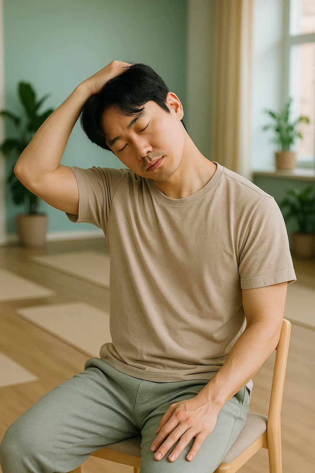 - (추가) 양손으로 깍지를 껴 뒤통수에 대고, 숨을 내쉬며 고개를 아래로 숙여 뒷목을 늘려줍니다.